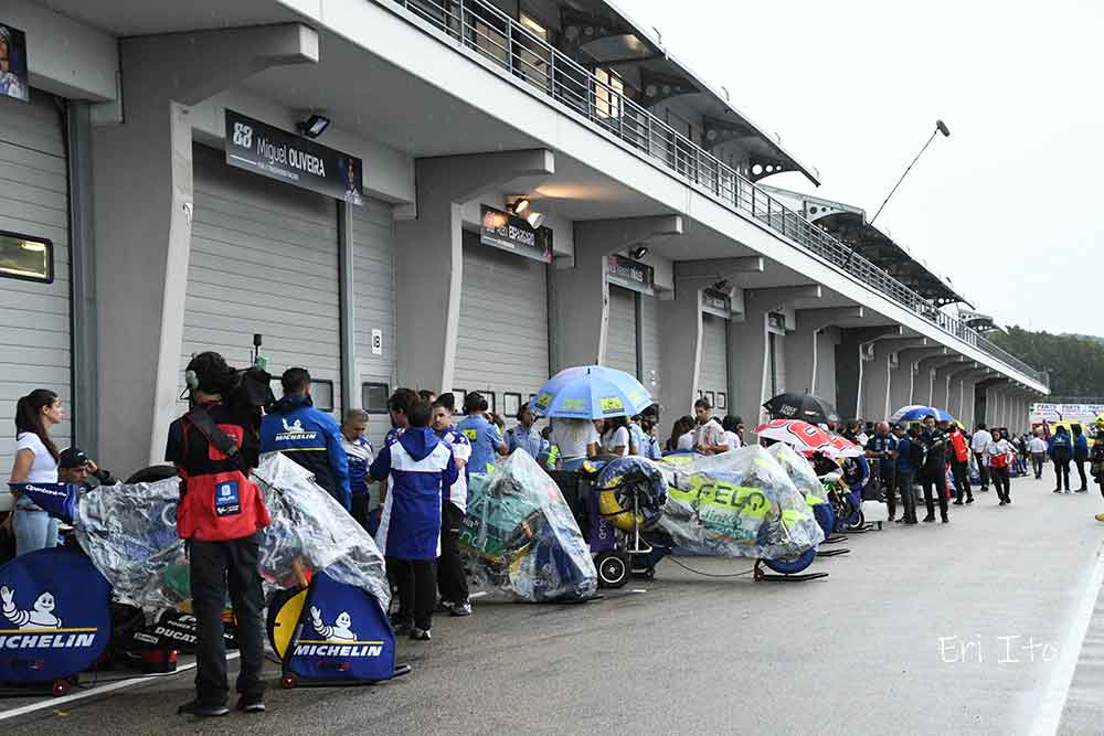 10周から8周に周回数が減らされてスタートすることになったのですが、「なぜ周回数が減らされたのか?」そして、「雨のレースは“電動バイクレース”のMotoEに影響するのか?」について取材しました。