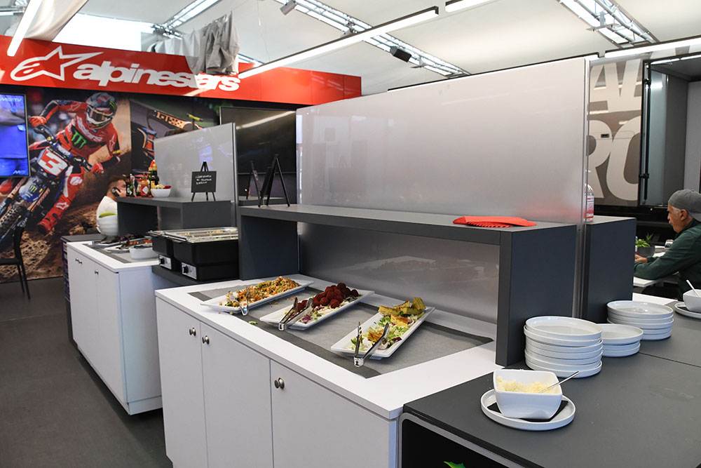 アルパインスターズがパドックにこうした立派なホスピタリティを持っているのには、もちろん理由がある。メディア・リレーションズ・マネージャーのクリス・ヒラードさんによれば、ゲストのもてなしのほか、ライダーなどとのコミュニケーションをとる場所として活用されているとのこと。例えば、フランチェスコ・バニャイアは、レースウイークの土曜日には、ドゥカティのホスピタリティではなくてこちらで自分のチームスタッフと食事をするそうだ。