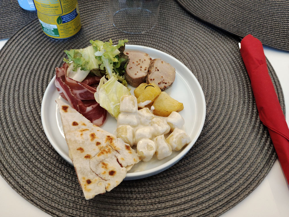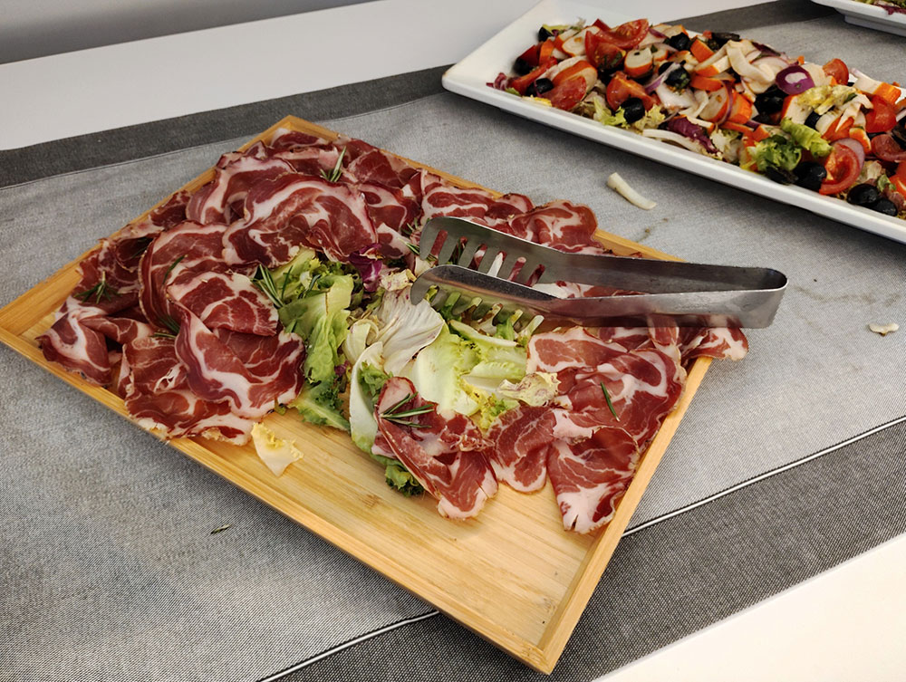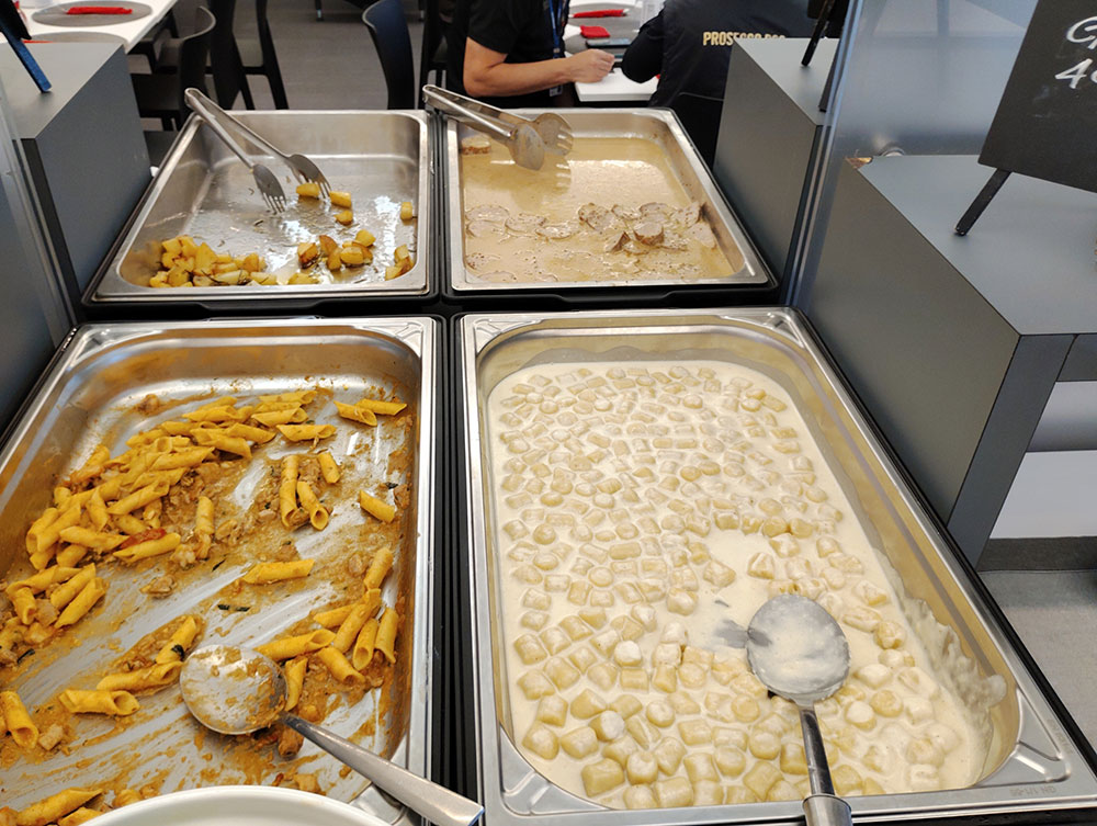 食事は多くのホスピタリティがそうであるように、ビュッフェスタイル。そこはイタリアン・メーカーのアルパインスターズなので、料理もイタリアンで、パスタやピザなどが並んでいた。わたしはクリームソースのニョッキをいただいたのだが、もちもちとしていてソースも濃厚でとてもおいしかった。「ティラミスが絶品!」という話だったのだけど、すでに品切れだったのは残念だった。