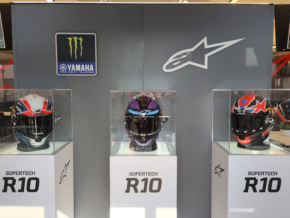ドアをくぐると、まずヘルメットが並んでいる。アルパインスターズは2023年からMotoGPライダーへのヘルメットのサポートを行っているのである。2025年は、ホルヘ・マルティン、ペドロ・アコスタ、ジャック・ミラー、それからMoto3ライダーの古里太陽をサポートしている。