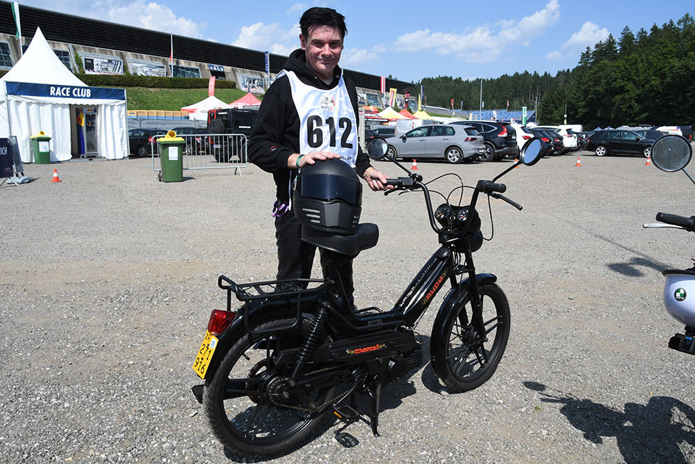 MotoGPを取材する知り合いのジャーナリスト、イムレ・パウロヴィッツさんもモペッドGPに参加していました。娘さんと一緒に走ったそうです。さすがジャーナリストというべきか、彼は長そで、革パン姿でした。この日は陽射しが強く、本当に暑かったので、汗をびっしょりかいていました。彼はスイスに住んでいるので、バンでオーストリアまでモペッド2台を運んできたそうです。