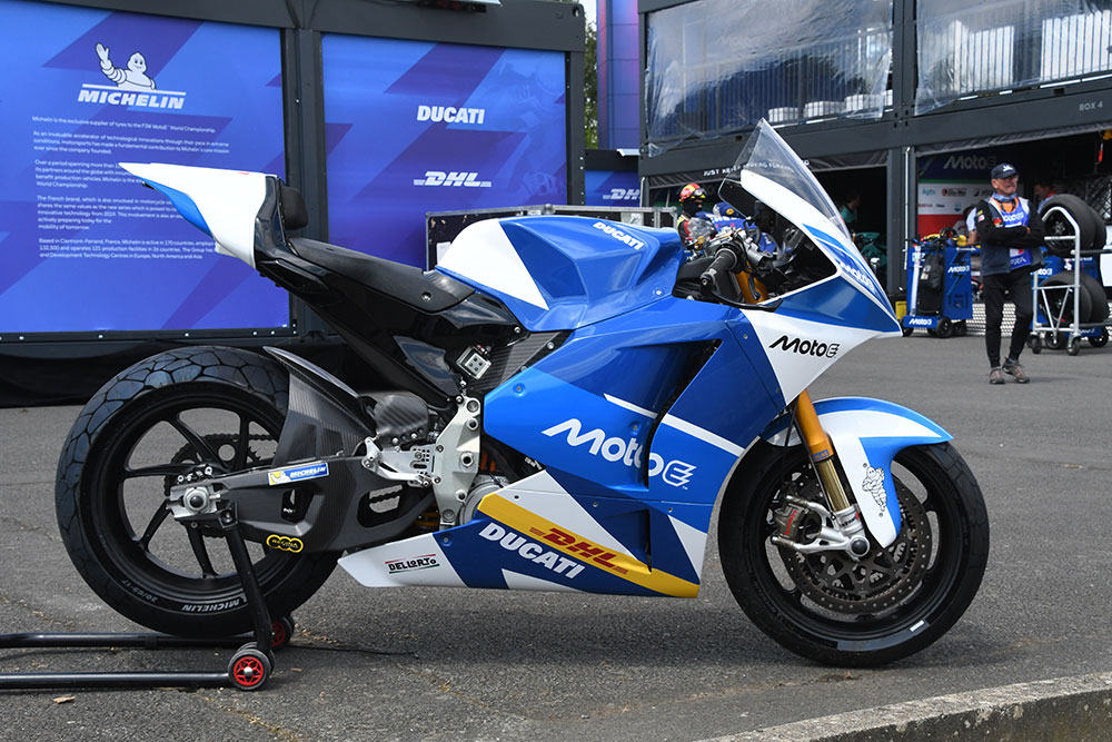 その前に、MotoEについておおまかに説明したい。2019年に始まったMotoEは、2019年から2022年まではイタリアのエネルジカ・モーターカンパニーの市販電動バイクをベースにした、エゴ・コルサのワンメイクだった。2023年からワンメイクマシンサプライヤーがドゥカティになり、2025年現在は、ドゥカティがMotoEのために開発した電動レーサー、V21Lが供給されている。