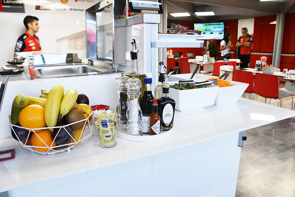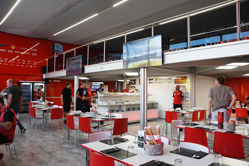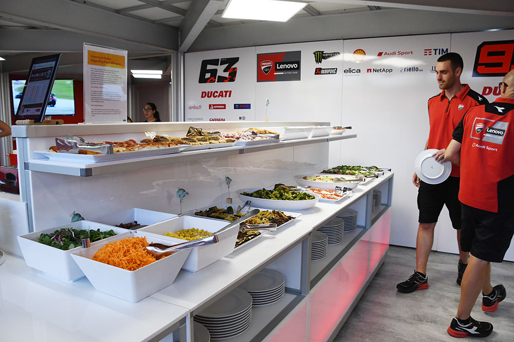 ドゥカティのホスピタリティでは、基本的に木曜日のランチから日曜日のランチまで、食事が提供される。ドゥカティ・ホスピタリティ・マネージャーのエレナ・カソラリさんによれば、ホスピタリティではチームスタッフの全員とライダー、ライダーの家族、ゲストなどがランチやディナーをとるということだ。