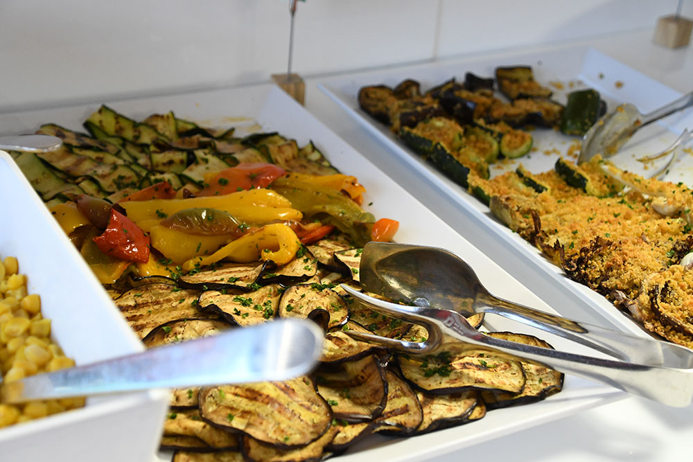 場合によりますが、通常は20種類くらいだと思います。ホットトレーには必ず2種類のパスタがあり、さらに2種類の肉や魚と野菜、あるいはメイン料理として肉2種類、または肉と魚、あるいは野菜と魚、といった具合です。