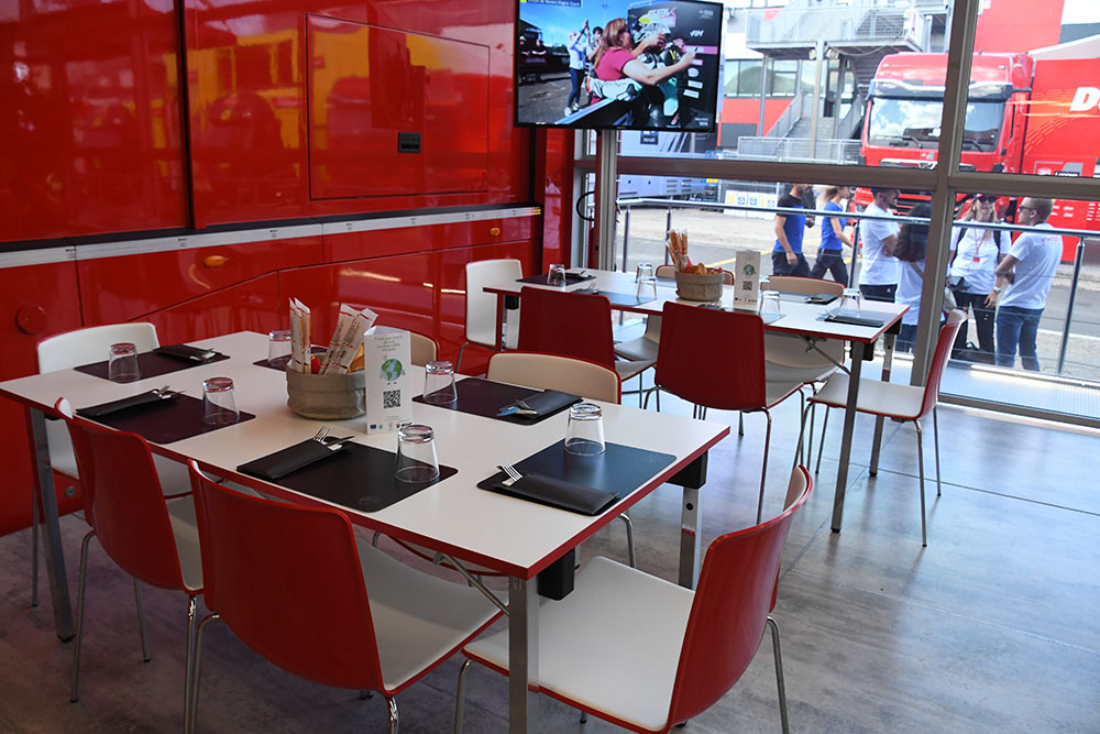 ドゥカティのホスピタリティは、2階構成になっている。ドアをくぐるとレセプションがあり(通常、ホスピタリティは関係者や招かれたゲストしか利用できない)、フロアにはテーブルとイスが並び、その中央には食事を並べるテーブルがある。