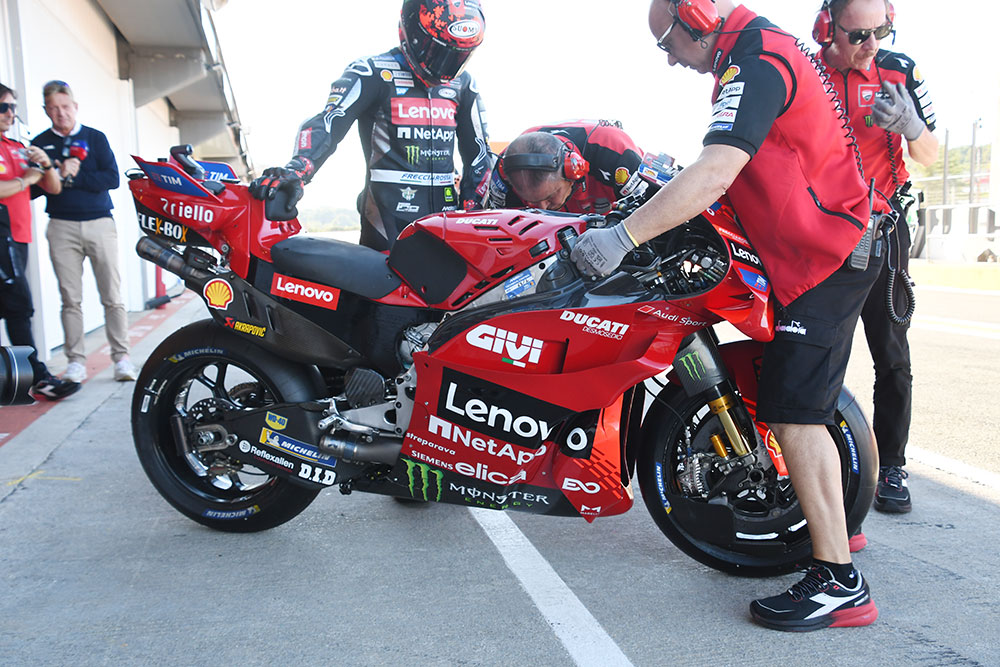 ドゥカティのフランチェスコ・バニャイアは、デスモセディチGP26の初期バージョンをテストした。外観からわかるのは、サイドの空力デバイスの形状が異なっているということだ。なお、マルク・マルケスはテストにも参加せず、ニコロ・ブレガが代役を務めた。