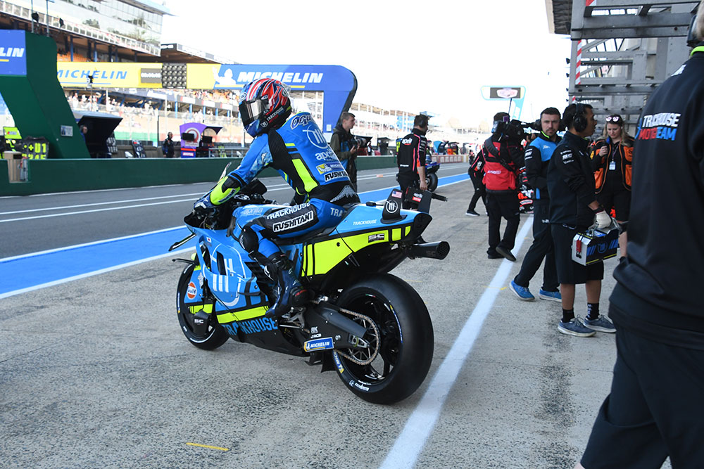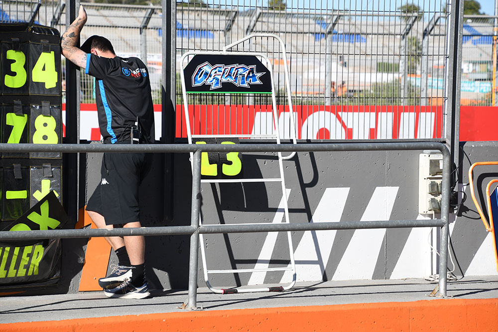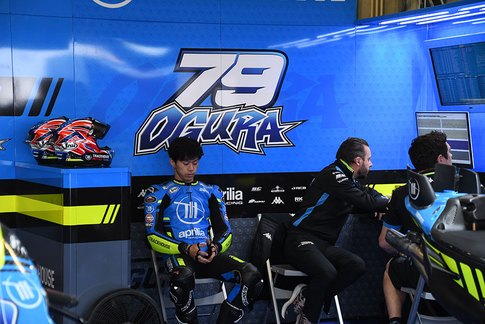 小椋藍のピットボードは、名前のロゴを使用したもの。小椋はピットでもレーシングスーツの背後にも、この「OGURA」ロゴを使用しています。ちなみに、MotoGPクラスにステップアップしてトラックハウス・MotoGP・チームのライダーになってからは、レーシングスーツの「OGURA」のロゴは、背中のハンプ(コブ)の部分に配置されているんですよ(Moto2時代は多くのライダーのように、腰部分にあった)。