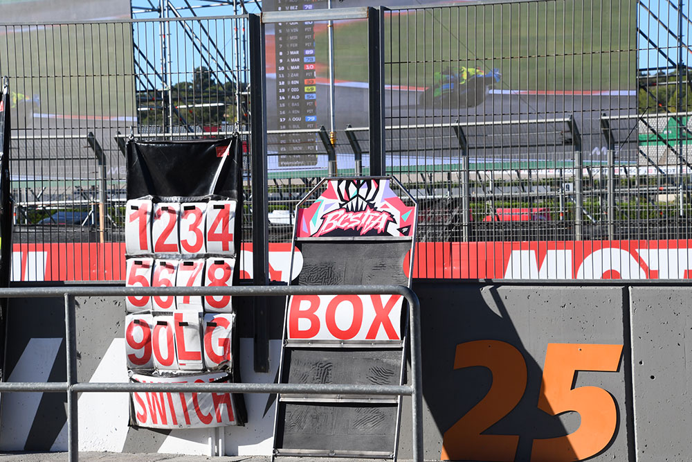 「ピットボード」は、ピットウオールからライダーに向けて出されるチームからのメッセージを表示するものです。前のラップのタイムや「ピットイン」の指示、レースでは後ろのライダーとのタイム差などが表示されます。日本では「サインボード」とも言いますね。