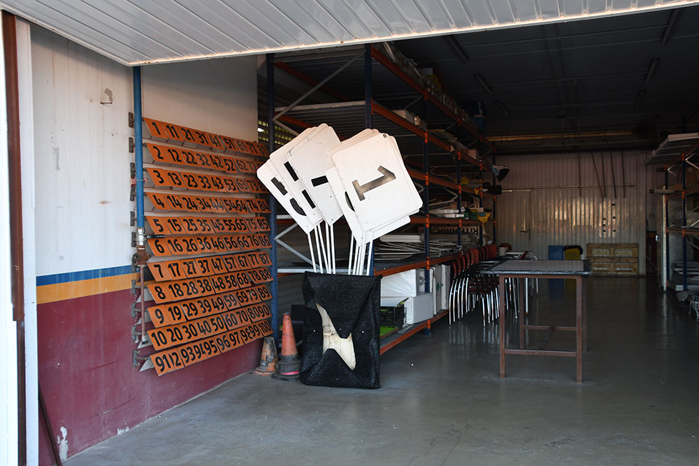 こちらの番号札、何に使用するものかすぐにわかったあなたは、かなりのMotoGP好きですね。左の壁にかかっているオレンジの番号は、サイティングラップでライダーがグリッドにつくときに各グリッドに置かれている番号。右の白い番号札は、ウオームアップ・ラップ後にライダーがグリッドにつくとき、列の位置を知らせるためにピットウオールから出されるものです。