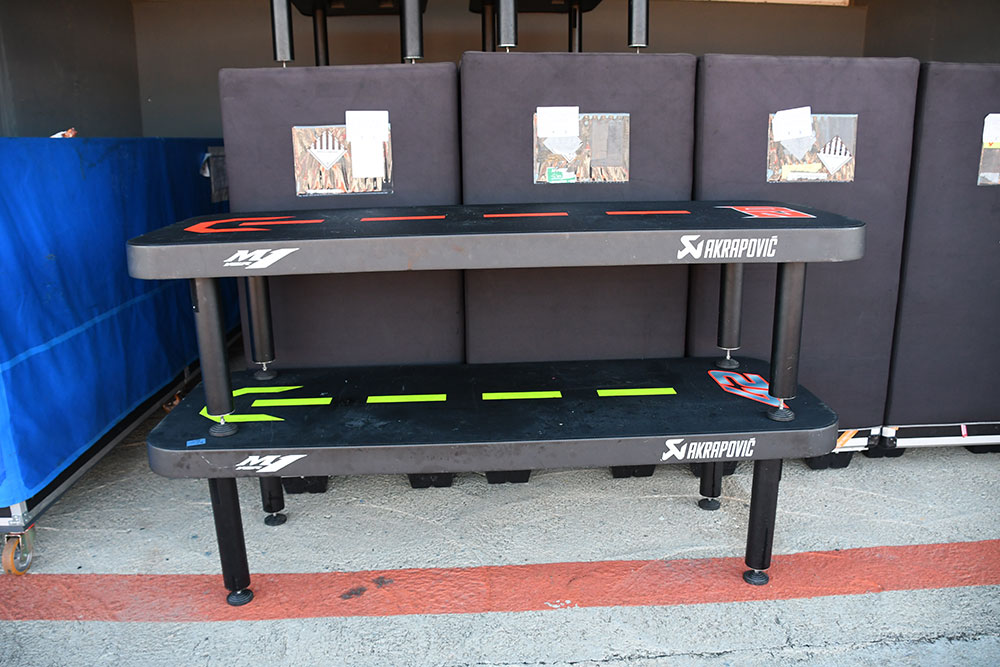 こちらはバイクを乗せるための台です。モンスターエナジー・ヤマハMotoGPチームのファビオ・クアルタラロとアレックス・リンスのものですね。走行を終えたバイクが、この台に乗せられます。台にマークされているのは、まっすぐに止めるための目印ですね。