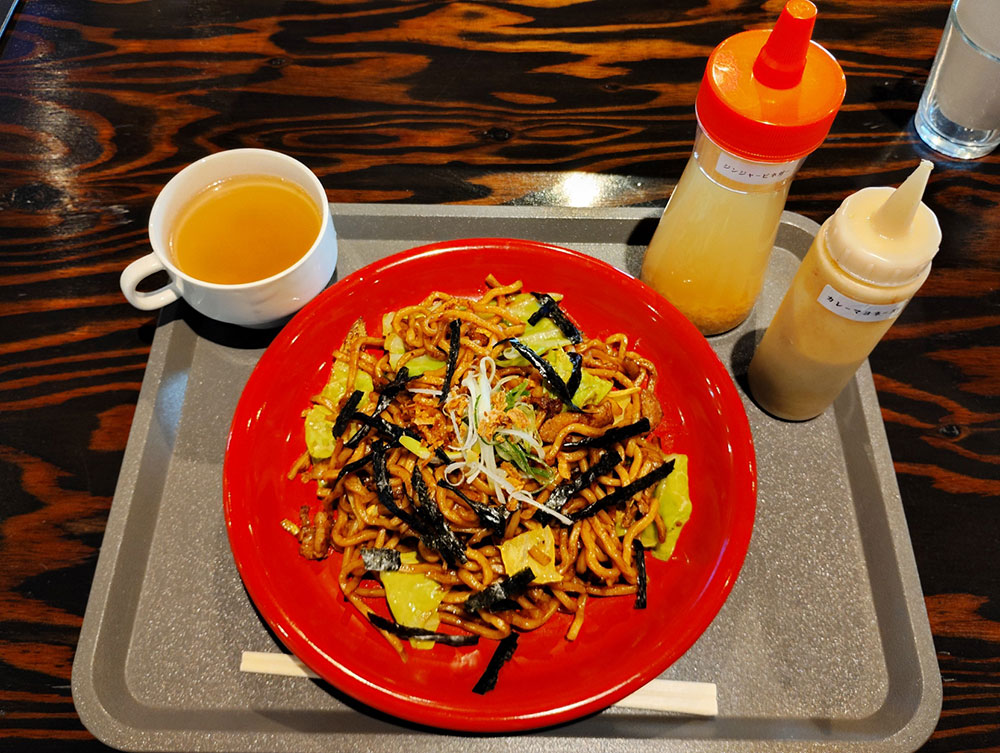 お店一押しは「座間焼きそば」。もっちり麺がくせになります。これはソース味ですが、しょうゆ味もありました。味変にジンジャービネガーとカレーマヨネーズがついています©Eri Ito