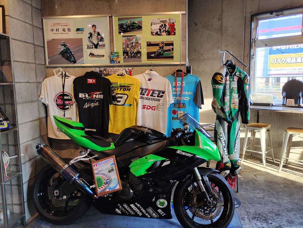 全日本ライダー、中村竜也選手のマシンやレーシングスーツがお店の一角に展示されていましたよ©Eri Ito