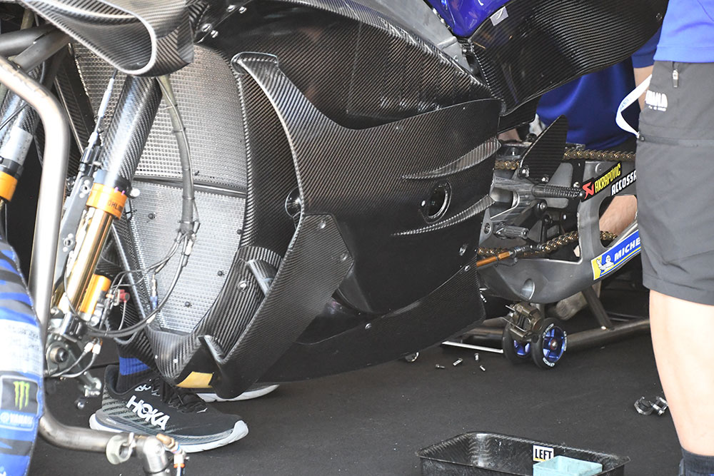 目に見える形での大きな変化といえば、フロントの空力デバイスだろう。2025年のテストや、テストライダーのアウグスト・フェルナンデスがワイルドカード参戦で走らせていたV4マシンは、まだ従来の直列4気筒のM1の空力デバイス形状だった。これが、ついに大きく変わった。また、サイドカウルの空力デバイスについても変化したものをテストしていた。